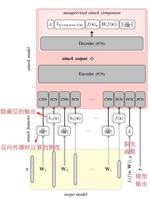 给定目标数据(x,y),攻击者在目标输入x上运行目标模型f,计算所有隐藏层、模型输出和损失函数。攻击者还会在反向传播时计算相对于每个层的参数的损耗梯度。这些计算构成了推理攻击的输入特征。